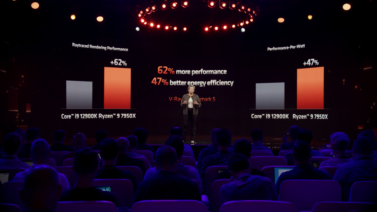 Do sử dụng tiến trình hiện đại hơn, dòng Zen 4 có thể mang lại hiệu năng tối đa trong khi vẫn tối ưu được điện năng sử dụng. Khi so sánh với Core i9 12900K, Ryzen™ 9 7950X có thể mang lại hiệu năng mỗi watt tốt hơn đến 47%, trong khi mang lại hiệu năng tổng thể vẫn tốt hơn 62% so với đối thủ.