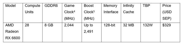 Card đồ hoạ AMD Radeon™ RX 6600 được phát triển hướng đến người dùng tầm trung với khả năng chơi các game hạng AAA ở tốc độ lên đến hơn 100fps, đủ sức thoả mãn cơn khát tốc độ của các màn hình chơi game thế hệ mới có tần số quét cao và đặc biệt là hiệu quả sử dụng năng lượng tốt hơn 30% so với đối thủ trong cùng phân khúc.Giá bán dự kiến sẽ từ 329USD và sẽ có mặt trên thị trường vào ngày 21/10 sắp tới từ nhiều đối tác sản xuất phần cứng gồm ASRock, ASUS, Gigabyte, MSI, PowerColor, SAPPHIRE, XFX và Yeston.