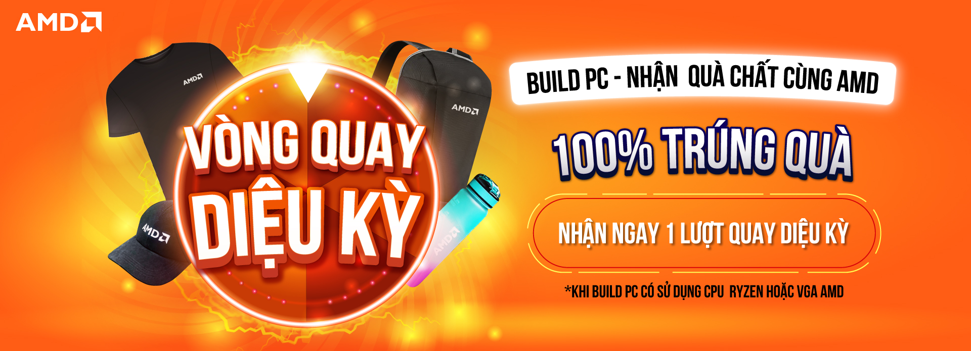 Khi khách hàng build PC có dùng CPU AMD Ryzen™ hoặc VGA AMD Radeon™ sẽ được 01 lượt quay VÒNG QUAY DIỆU KỲ trúng thưởng 100% nhận quà tặng từ AMD