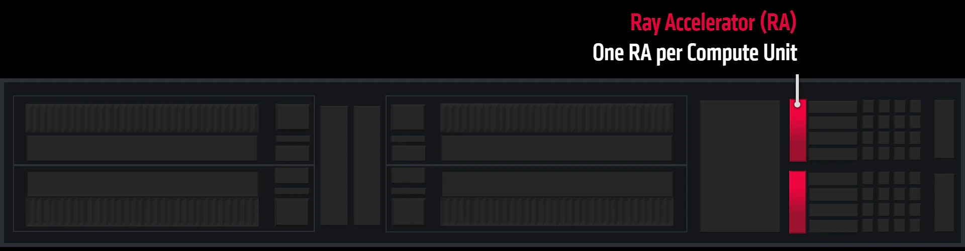 Điểm mới đối với đơn vị tính toán AMD RDNA 2 là việc triển khai kiến trúc tăng tốc dò tia hiệu suất cao được gọi là Ray Accelerator. Ray Accelerator là phần cứng chuyên dụng xử lý giao điểm của các tia cung cấp một cấp khuyếch đại tăng cường trong hiệu suất giao cắt so với triển khai phần mềm.4