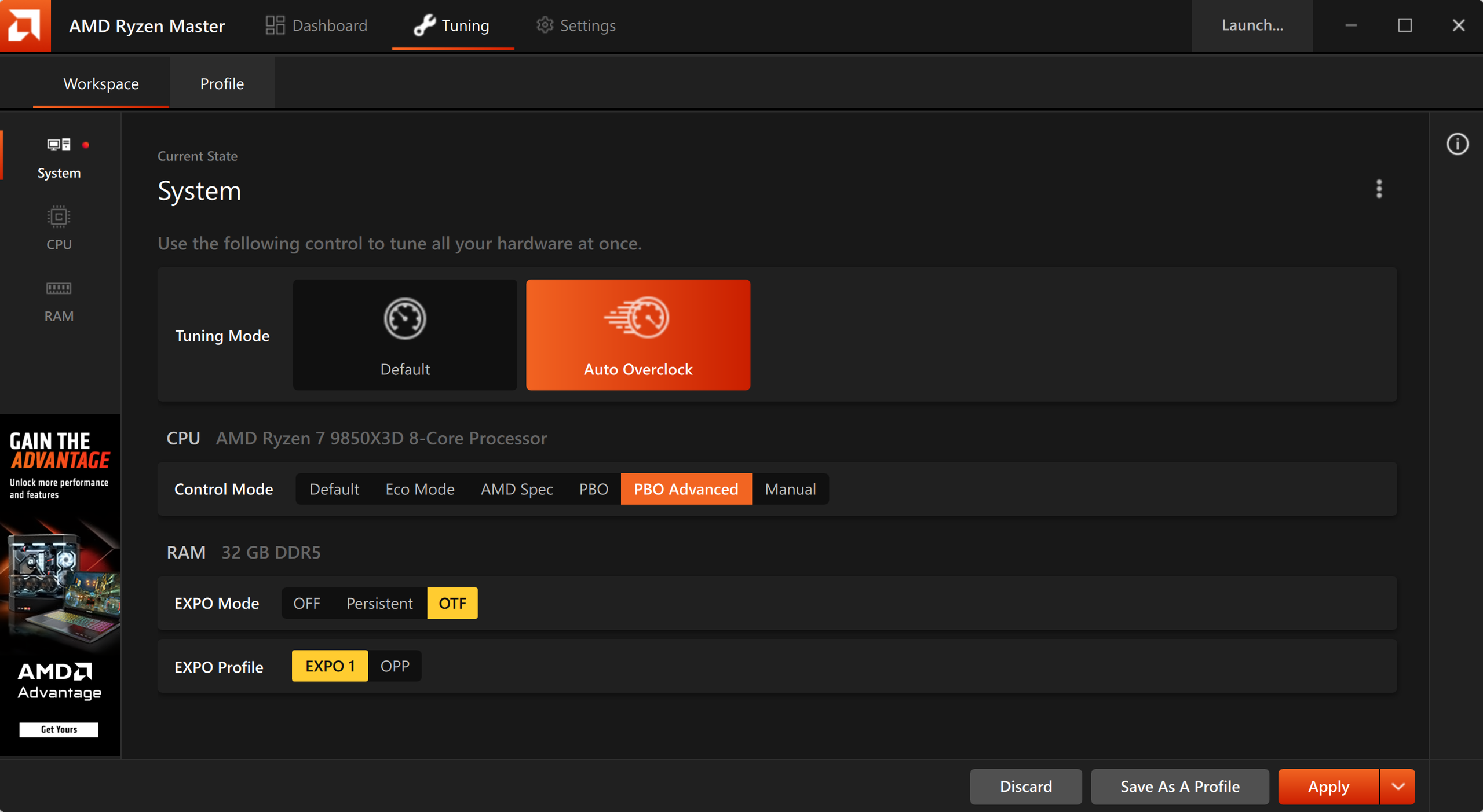 Trong bài thử nghiệm này, hệ thống được benchmark ở trạng thái mặc định, sau đó có kích hoạt các công cụ tối ưu như AMD Ryzen Master Auto OC và OnFly X3D. Tuy nhiên, cần nói thẳng rằng việc ép xung trên Ryzen™ 7 9850X3D mang tính tinh chỉnh nhiều hơn là tạo ra khác biệt lớn về hiệu năng tổng thể. Các công cụ này chủ yếu giúp CPU duy trì xung boost ổn định hơn, cải thiện độ nhất quán trong quá trình tải nặng, thay vì đem lại những cú nhảy vọt rõ rệt về điểm benchmark.