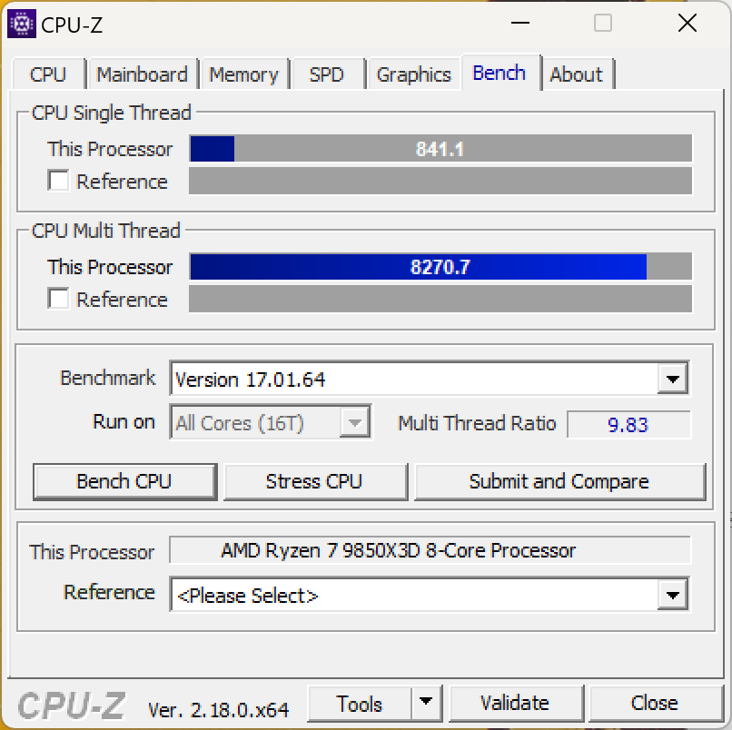 Ở CPU-Z Benchmark (v17.01.64), hệ thống ghi nhận khoảng 841 điểm đơn nhân và 8.270 điểm đa nhân.