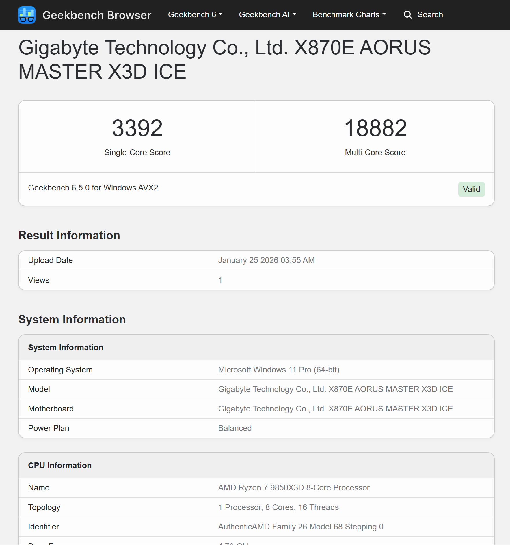 Với Geekbench 6, Ryzen 7 9850X3D đạt 3.392 điểm đơn nhân và 18.882 điểm đa nhân trong cấu hình mặc định.