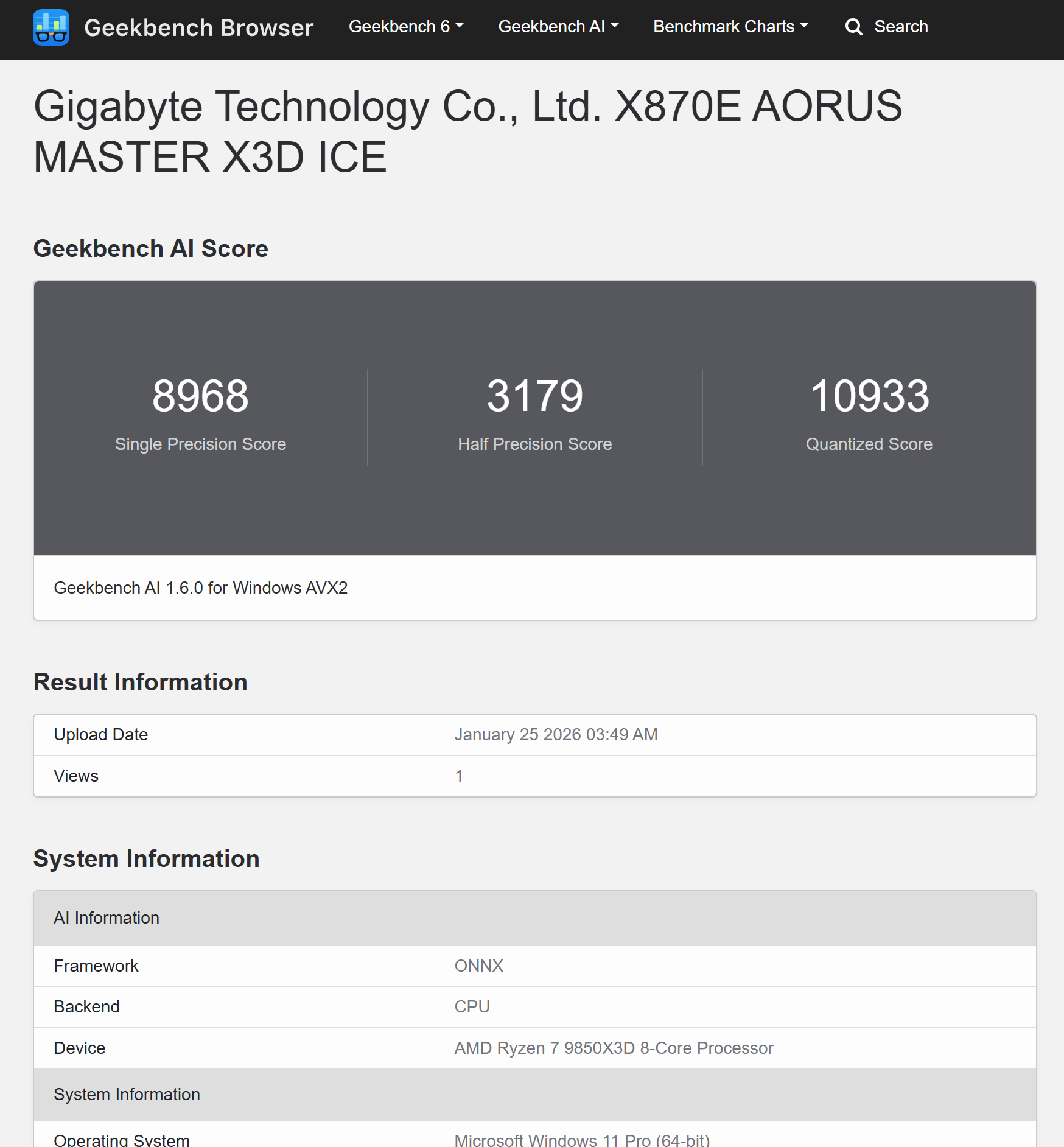 Ở Geekbench AI (backend CPU, ONNX), Ryzen 7 9850X3D đạt 8.968 điểm Single Precision, 3.179 điểm Half Precision và 10.933 điểm Quantized.