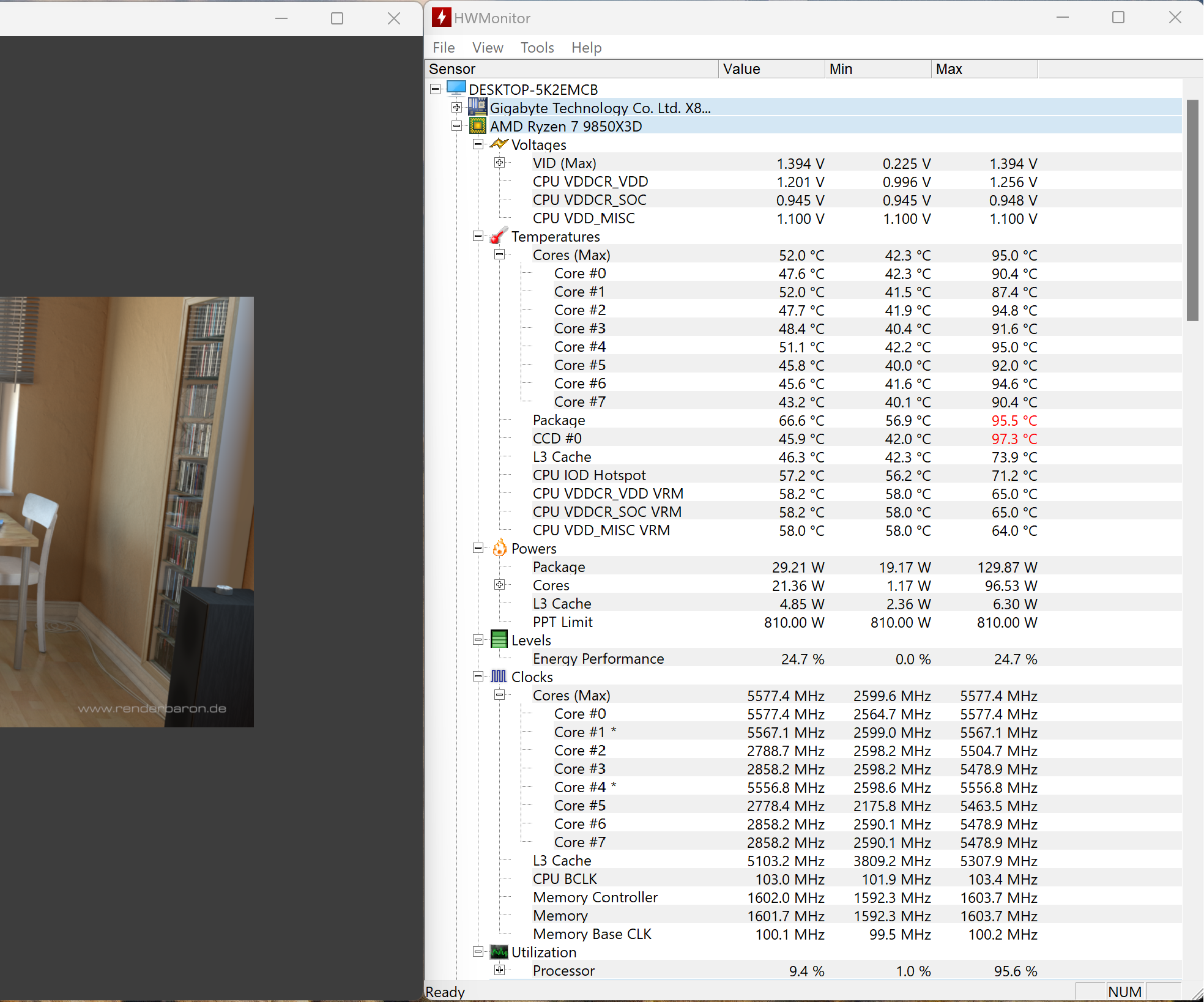 Trong các bài stress test nặng, nhiệt độ của Ryzen™ 7 9850X3D có thể tiệm cận, thậm chí chạm ngưỡng trên 90°C, đặc biệt tại CCD (khu vực tập trung nhân xử lý). Tuy nhiên, đây là hành vi đã được AMD thiết kế sẵn. Các bộ xử lý Ryzen hiện đại sử dụng cơ chế kiểm soát theo TjMax, cho phép CPU chủ động đẩy xung và điện áp lên mức cao nhất có thể cho tới khi đạt ngưỡng nhiệt an toàn, sau đó tự điều chỉnh để duy trì trạng thái ổn định. Nói cách khác, việc CPU hoạt động ở mức nhiệt cao trong thời gian ngắn không đồng nghĩa với quá nhiệt hay mất an toàn, miễn là hệ thống tản nhiệt được thiết lập đúng cách.