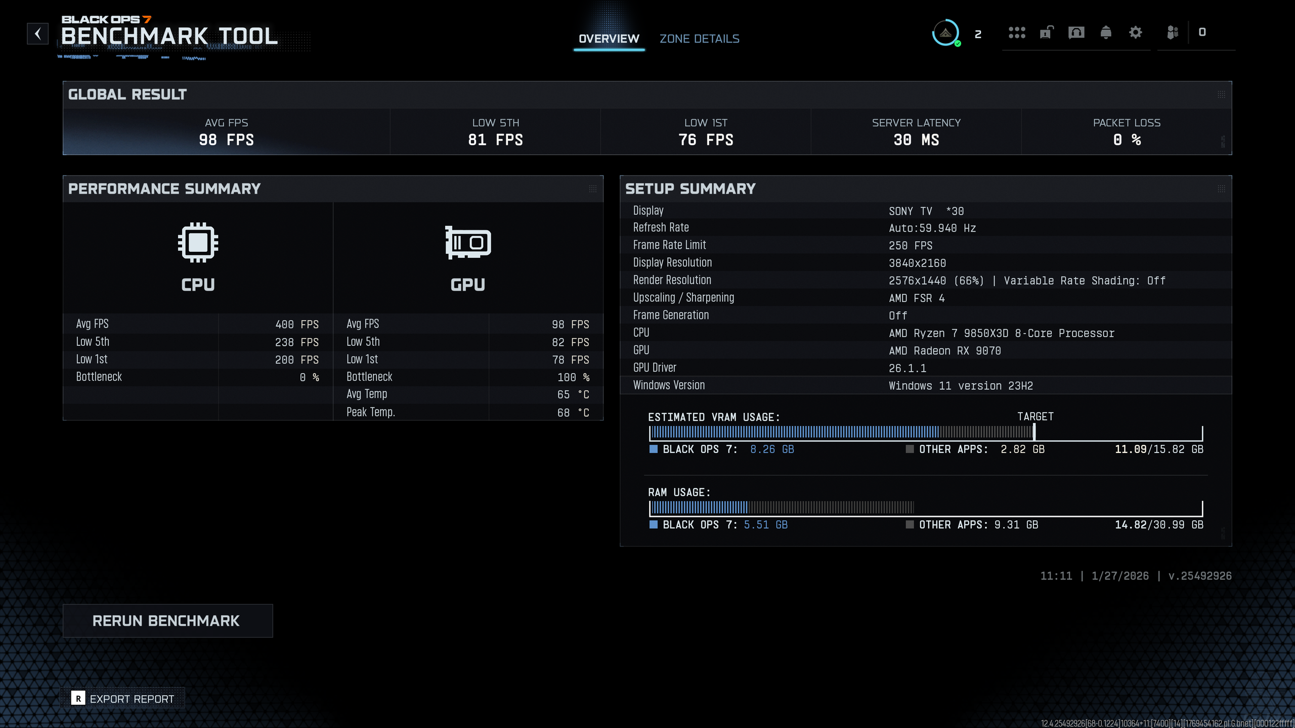 Ở thiết lập Extreme không bật Frame Generation, FPS trung bình vẫn duy trì quanh ~98 FPS, với 1% Low và 5% Low lần lượt đạt 76 và 81 FPS. Trong bối cảnh tải đồ họa rất nặng ở 4K, mức khung hình thấp này cho thấy Ryzen 7 9850X3D không trở thành nút thắt hiệu năng, đồng thời vẫn giữ được độ ổn định khung hình nền, hạn chế các pha tụt FPS đột ngột.