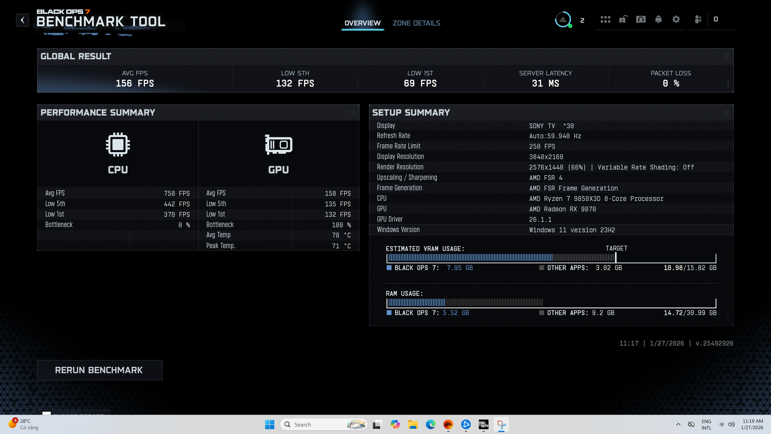 Với Black Ops 7, các bài test cho thấy Ryzen™ 7 9850X3D vẫn giữ được lợi thế rất rõ về độ ổn định khung hình. Ở các thiết lập từ 1440p đến 4K, FPS trung bình luôn ở mức cao, nhưng điểm đáng chú ý nằm ở chỉ số 1% Low và 5% Low. FPS thấp nhất vẫn được giữ ở mức rất "đẹp", hạn chế rõ rệt hiện tượng khựng hình trong giao tranh đông người.