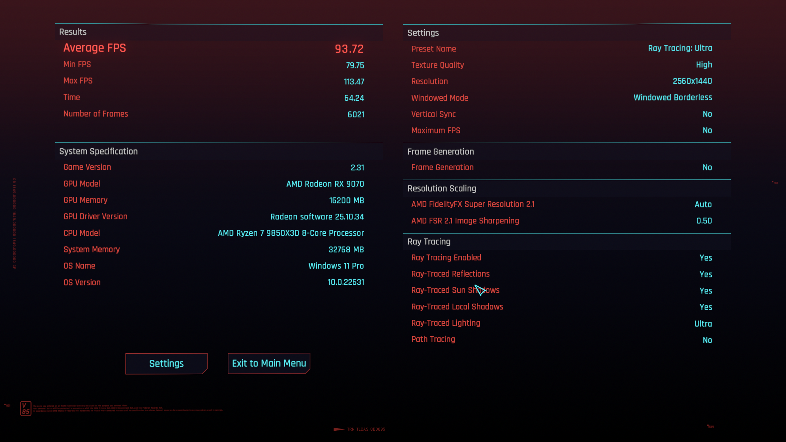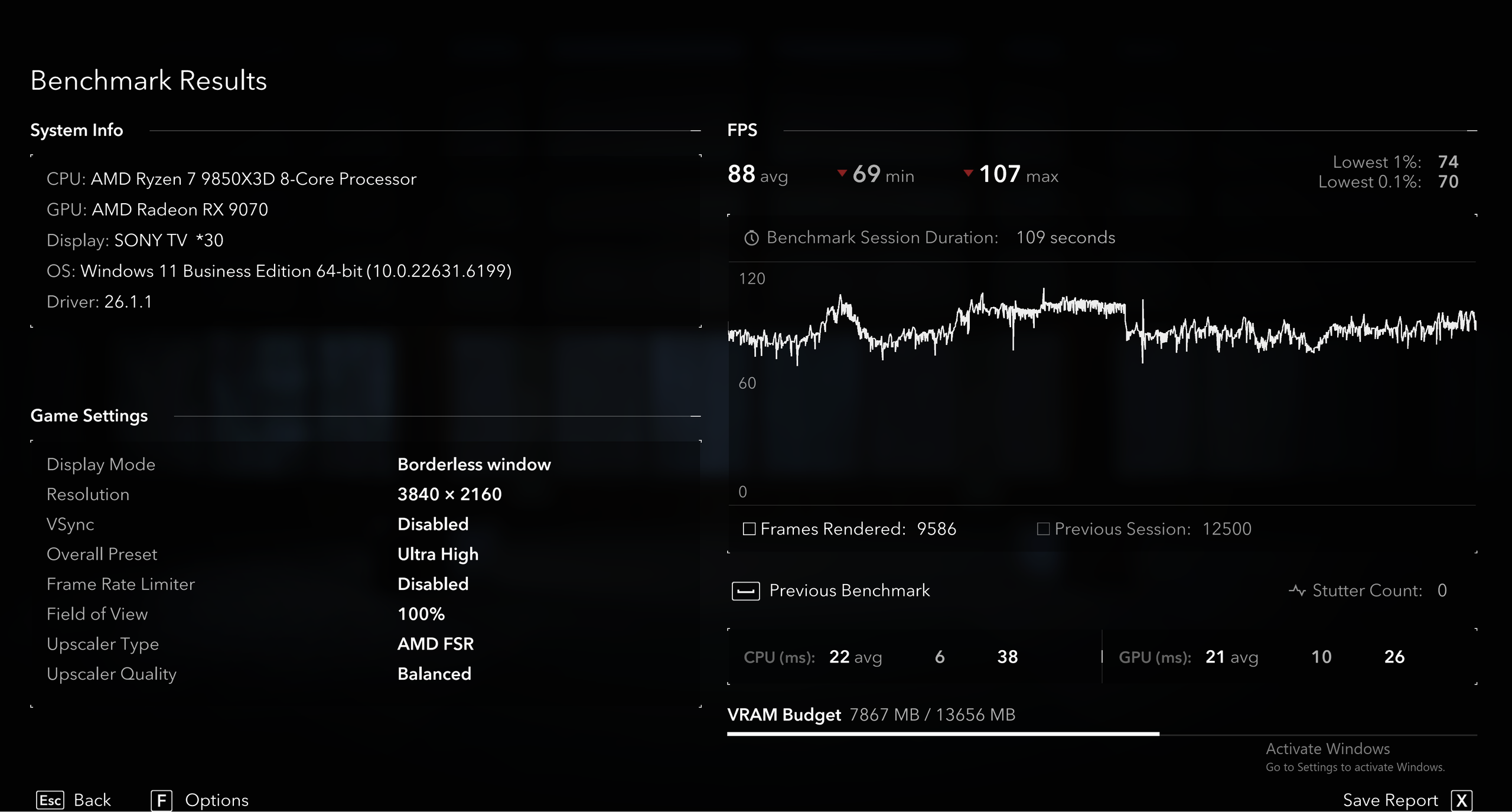 Ở độ phân giải này, GPU rõ ràng là giới hạn chính, nhưng chỉ số phụ "CPU FPS" lại cho thấy một bức tranh khác: trong khi GPU đang xử lý khối lượng render nặng nề, Ryzen™ 7 9850X3D vẫn có thể chuẩn bị pipeline khung hình với tốc độ lên tới hơn 360 FPS. Điều này cho thấy CPU đang tạo ra một khoảng headroom rất lớn về xử lý logic và dữ liệu, đảm bảo rằng ngay cả trong các phân cảnh phức tạp nhất, CPU sẽ không trở thành yếu tố gây tụt hiệu năng.